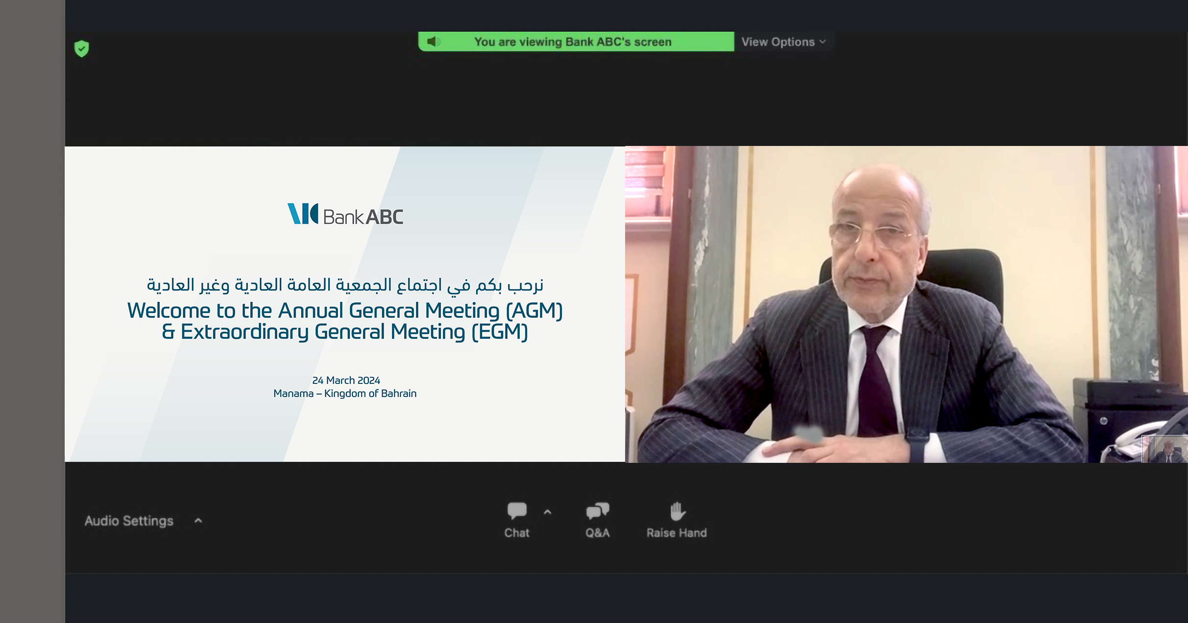 المنامة، البحرين: عقد بنك ABC، البنك الدولي الرائد في منطقة الشرق الأوسط وشمال أفريقيا، اجتماعي الجمعية العامة العادية وغير العادية إلكترونيًا يوم الأحد الموافق 24 مارس 2024. وقد ترأس كلا الاجتماعين رئيس مجلس إدارة المجموعة السيد/ الصديق عمر الكبير، والرئيس التنفيذي للمجموعة السيد/ صائل الوعري، واختتم الاجتماعين بموافقة المساهمين على جميع القرارات التي أوصى بها مجلس إدارة بنك ABC.